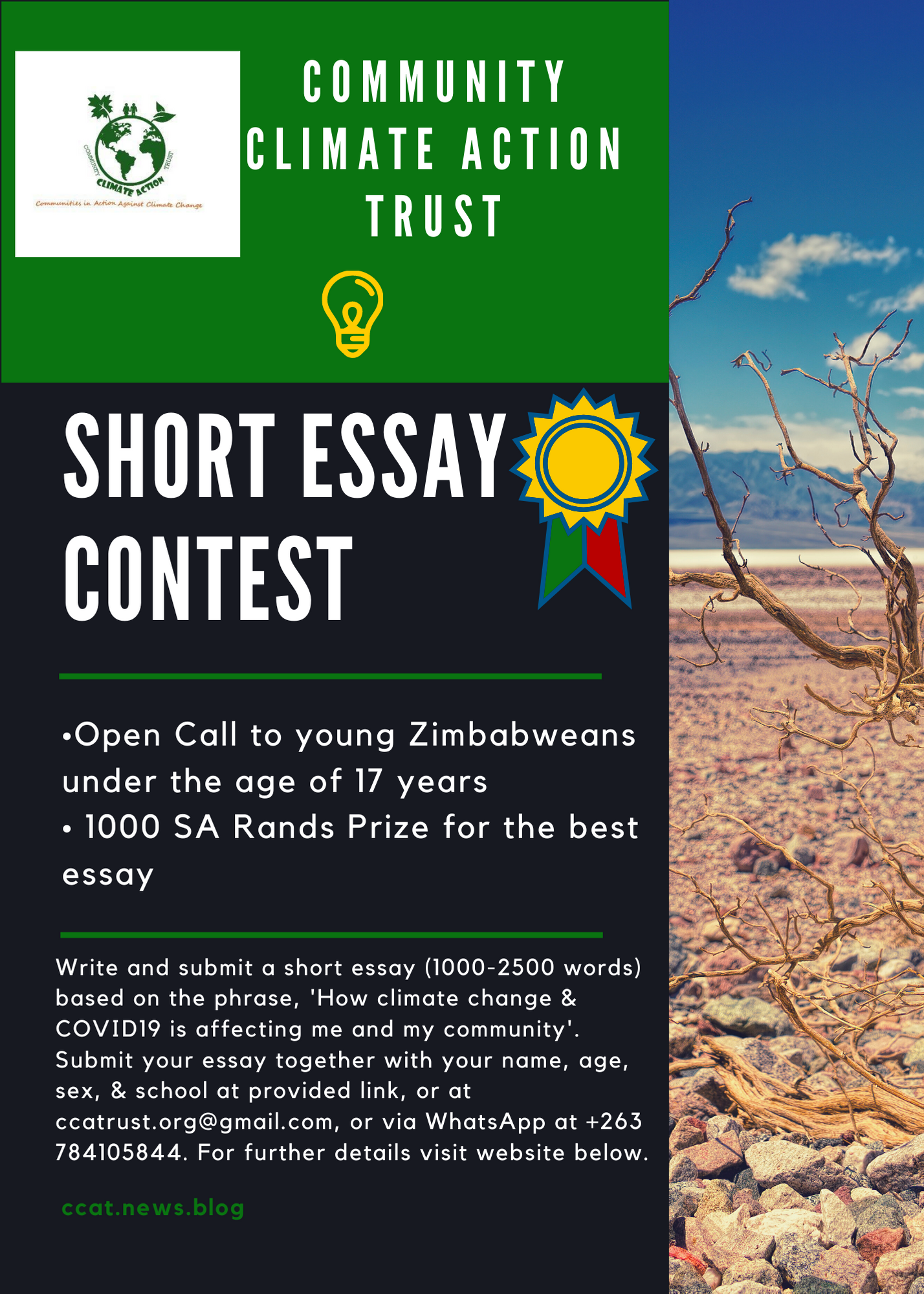 One thousand Rands award to be made in December 2020 to the top-ranked essay based on the Topic, “How Climate Change & COVID-19 has affected me.” Top five essays will be published on CCAT’s News Site. Write an essay of between 1000 and 2500 words describing how climate change impacts & the COVID-19 pandemic has affected you and the community you live in. The Short Essay contest is open to young Zimbabweans under the age of 17 and seeks to amplify voices of young people in addressing the Climate Change & COVID19 crises & their combined impacts which have arguably hit Zimbabwe harder than most countries in the world.